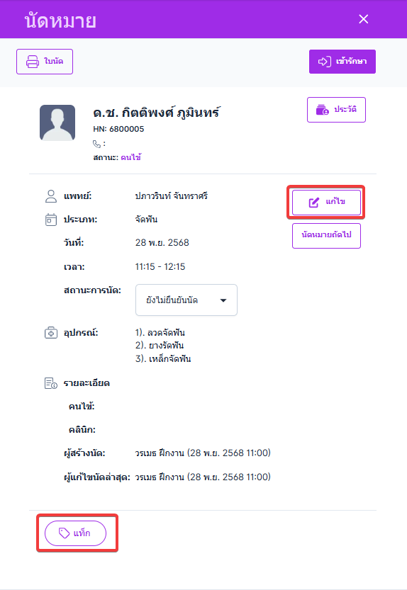 ผู้ใช้งานสามารถคลิกที่ แก้ไข เพื่อแก้ไขข้อมูลการนัดหมายได้