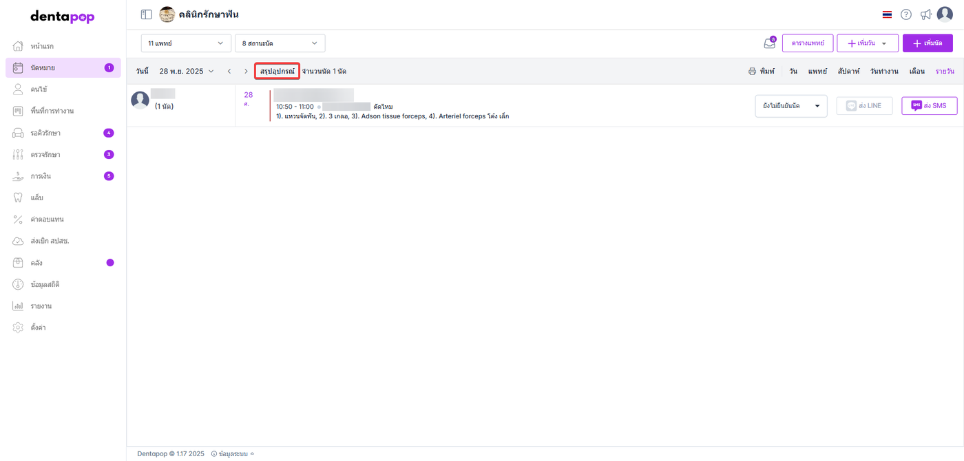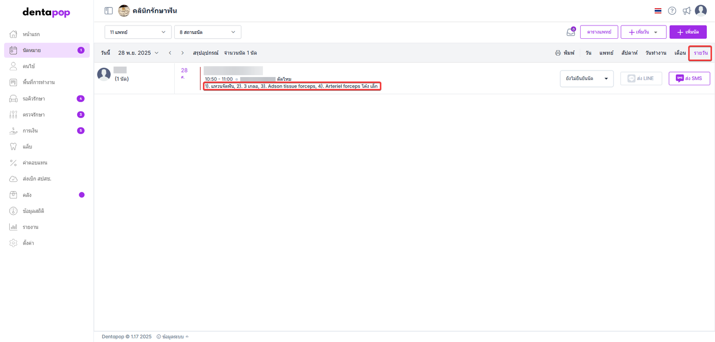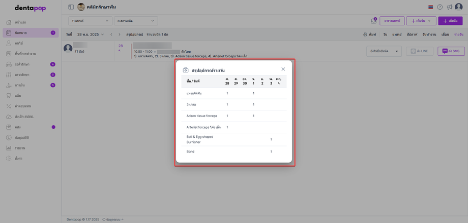 ระบบจะแสดงอุปกรณ์รายวัน โดยแยกตามรายชื่อแพทย์ (ภายในระยะเวลา7วัน)
