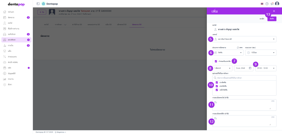 ระบบจะแสดงหน้าการเพิ่มนัดหมายโดยใส่ชื่อคนไข้โดยอัตโนมัติ