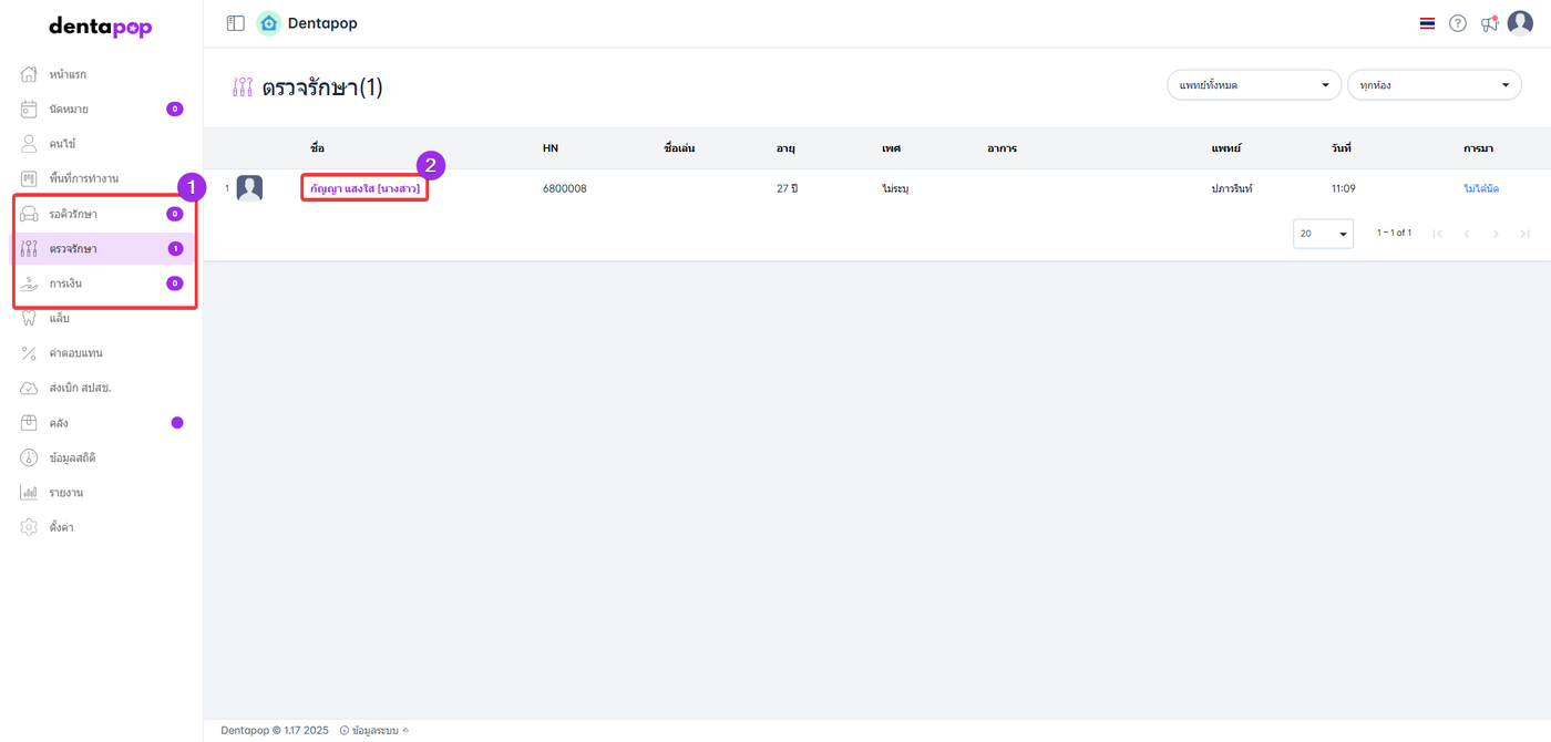 1.ผู้ใช้งานเลือกเมนูตรวจรักษา หรือ การเงิน