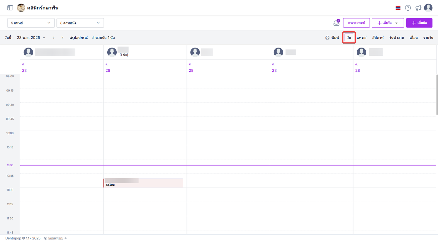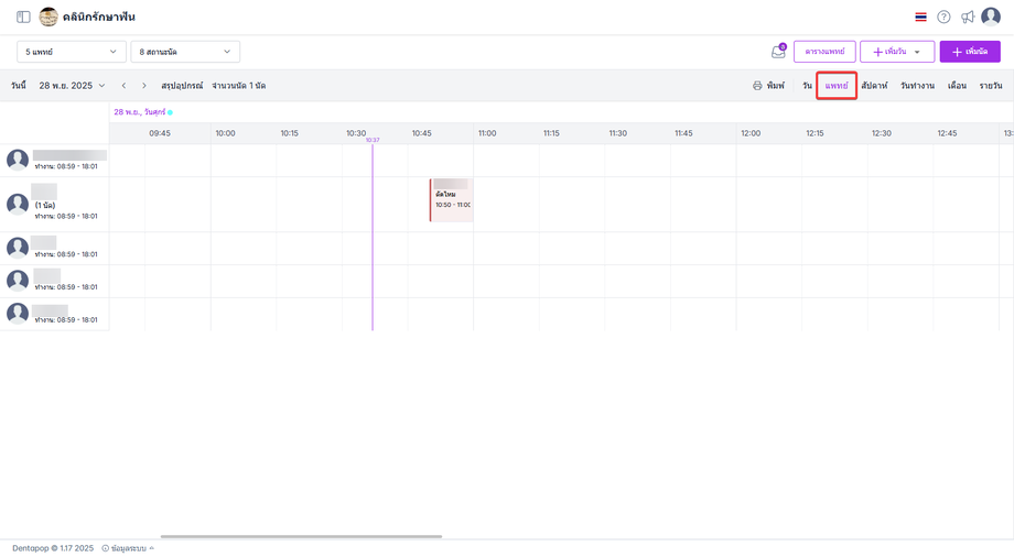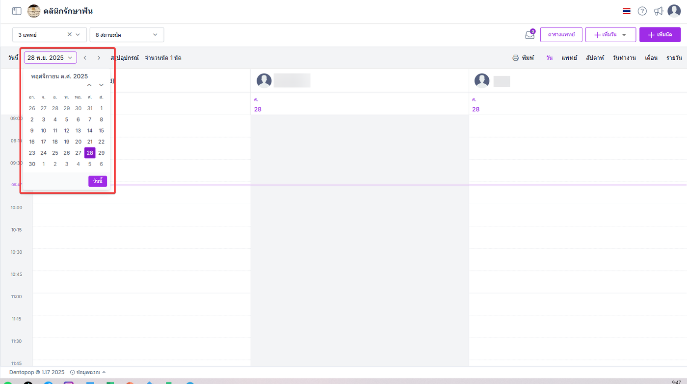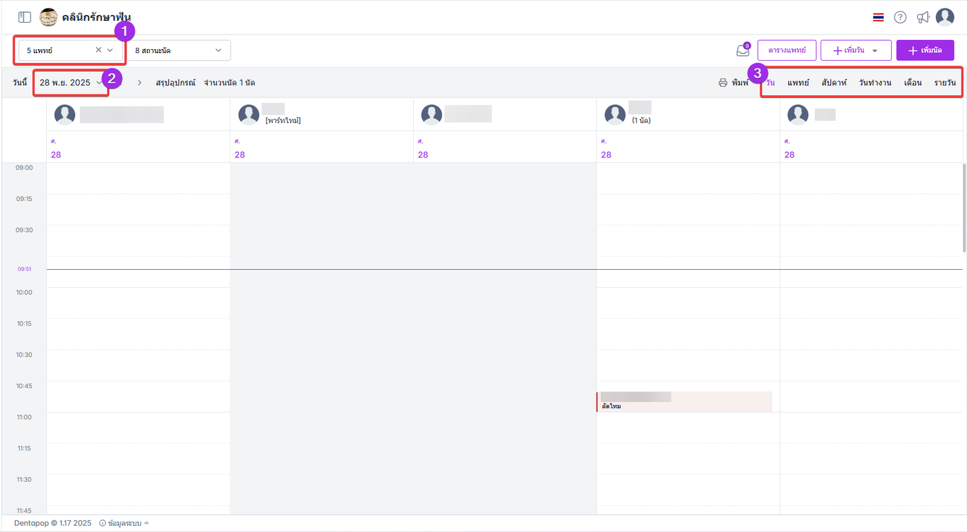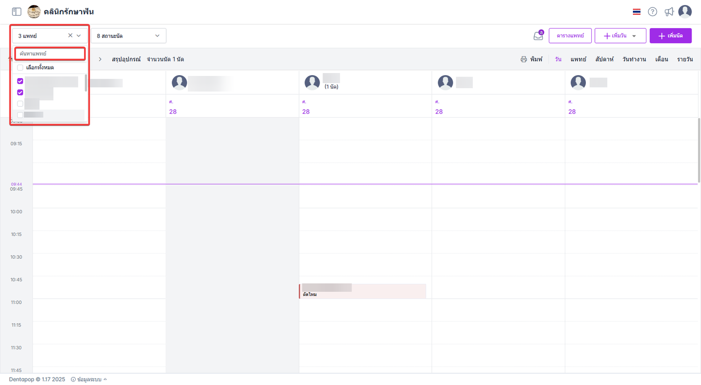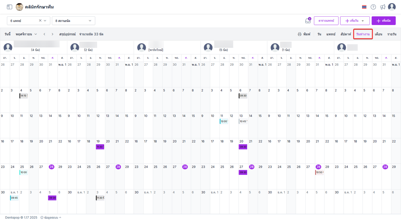 แสดงวันที่ตามตารางทำงานและรายการนัดหมายของแพทย์แต่ละคน