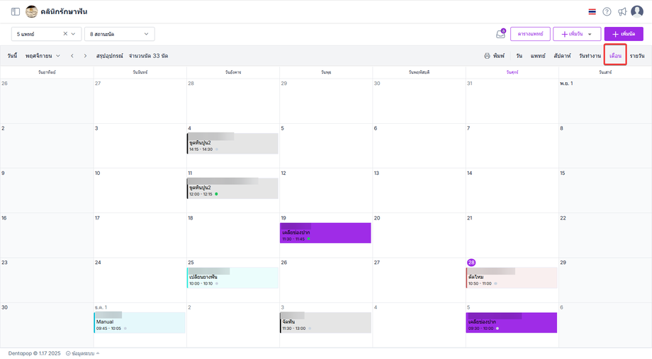 แสดงในรูปแบบเดือนและการนัดหมายของแต่ละวันภายในเดือนที่เลือก