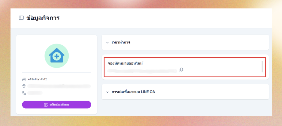 ผู้ใช้งานสามารถนำลิงก์ จองนัดหมายออนไลน์ ในหน้าข้อมูลคลิกนิกแชร์ให้ลูกค้าเพื่อจองนัดหมายออนไลน์ได้