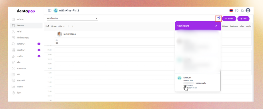 เมื่อลูกค้าทำการจองนัดหมายสำเร็จ ระบบจะแสดงรายการจองในหมายที่กล่องข้อความจองนัดหมายในเมนูนัดหมาย