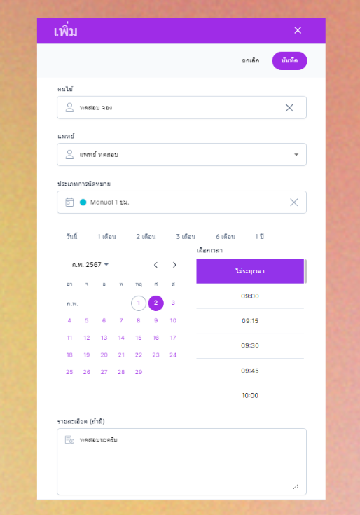 คนไข้ : หากลูกค้าที่ทำการจองนัดหมายมีประวัติในคลินิกอยู่แล้วระบบจะแสดงชื่อคนไข้ให้เลือก หากไม่มีผู้ใช้งานสามารถเพิ่มได้ 2 วิธี