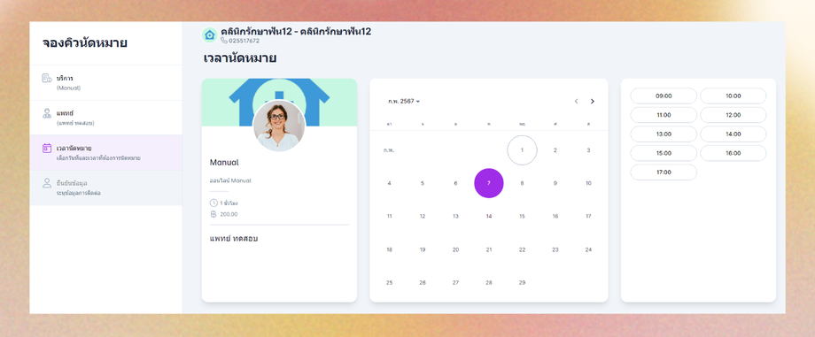 เลือกวันที่และเวลานัดหมาย ระบบจะแสดงวันที่และเวลานัดได้เฉพาะวันที่แพทย์ที่ลูกค้าเลือกมีตารางนัดในวันและเวลานั้น
