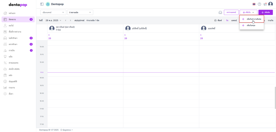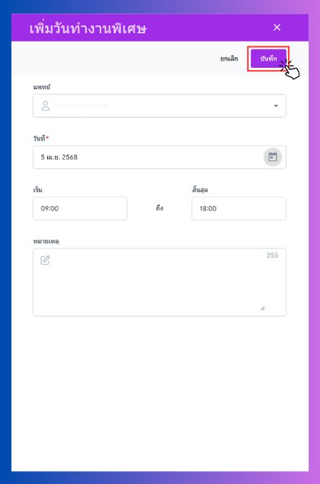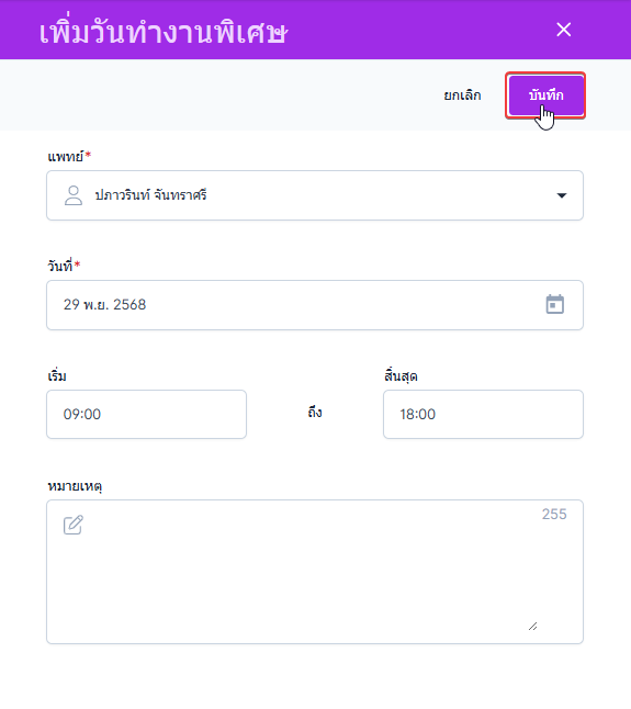 เป็นการบันทึกการแจ้งวันทำงานพิเศษของแพทย์ โดยเจ้าหน้าที่สามารถบันทึกวันทำงานพิเศษของแพทย์ในหน้าการนัดหมายได้ เมื่อได้รับแจ้งจากแพทย์ในการลา หรือ หยุด โดยสามารถกำหนดวันที่ และเวลาการทำงานพิเศษได้