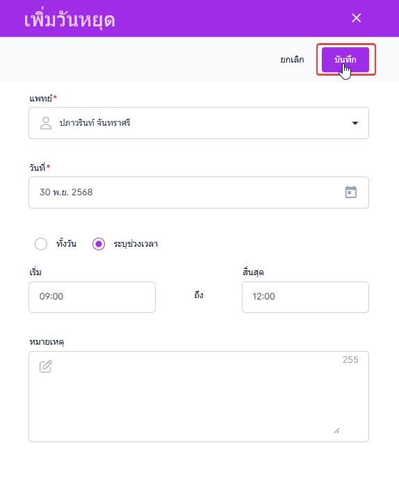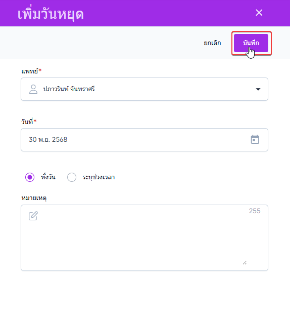 เลือกวันหยุดทั้งวัน หรือ ระบุช่วงเวลา