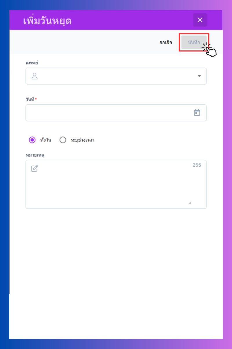 - เลือกวันหยุดทั้งวัน หรือ ระบุช่วงเวลา