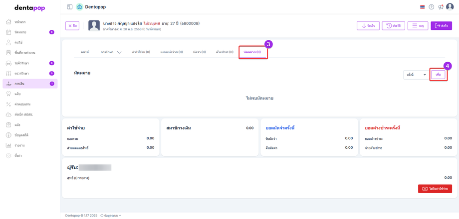 เมื่อคลิกเข้ามาในข้อมูลคนไข้ให้เลือกหัวข้อนัดหมาย
