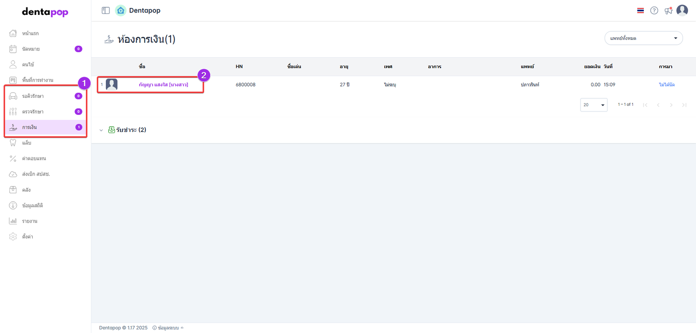 เลือกเมนู รอคิวรักษา ตรวจรักษา และการเงิน (ตัวอย่าง ทำรายการจากห้องการเงิน)