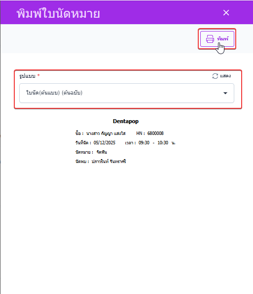 หากผู้ใช้งานคลิกที่พิมพ์ผู้ใช้งานจะเข้าสู่หน้าพิมพ์ใบนัดหมาย ผู้ใช้งานสามารถเปลี่ยนรูปแบบเอกสารใบนัดหมายและสั่งพิมพ์ได้