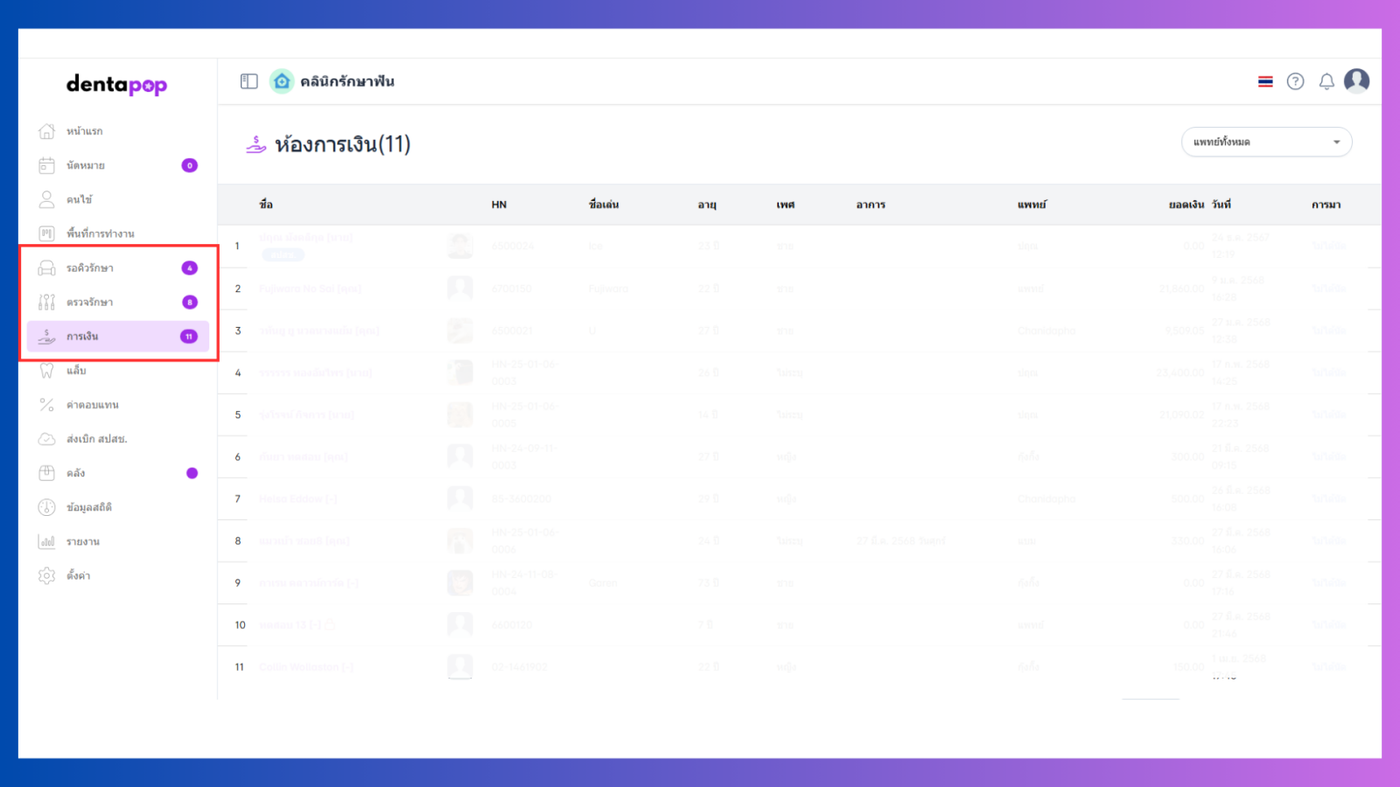 - เลือกเมนูรอคิวรักษา ตรวจรักษา และ การเงิน