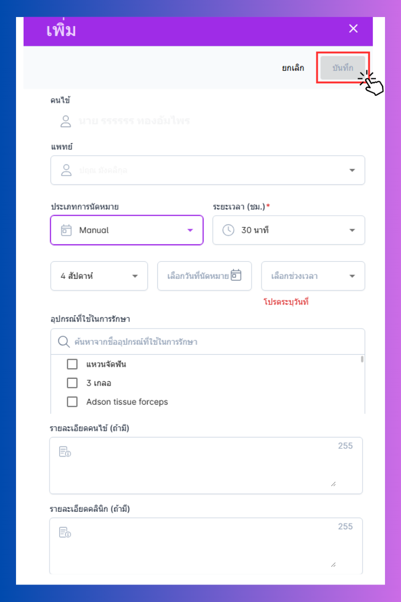 - ระบบจะแสดงหน้าการเพิ่มนัดหมายโดยใส่ชื่อคนไข้โดยอัตโนมัติ