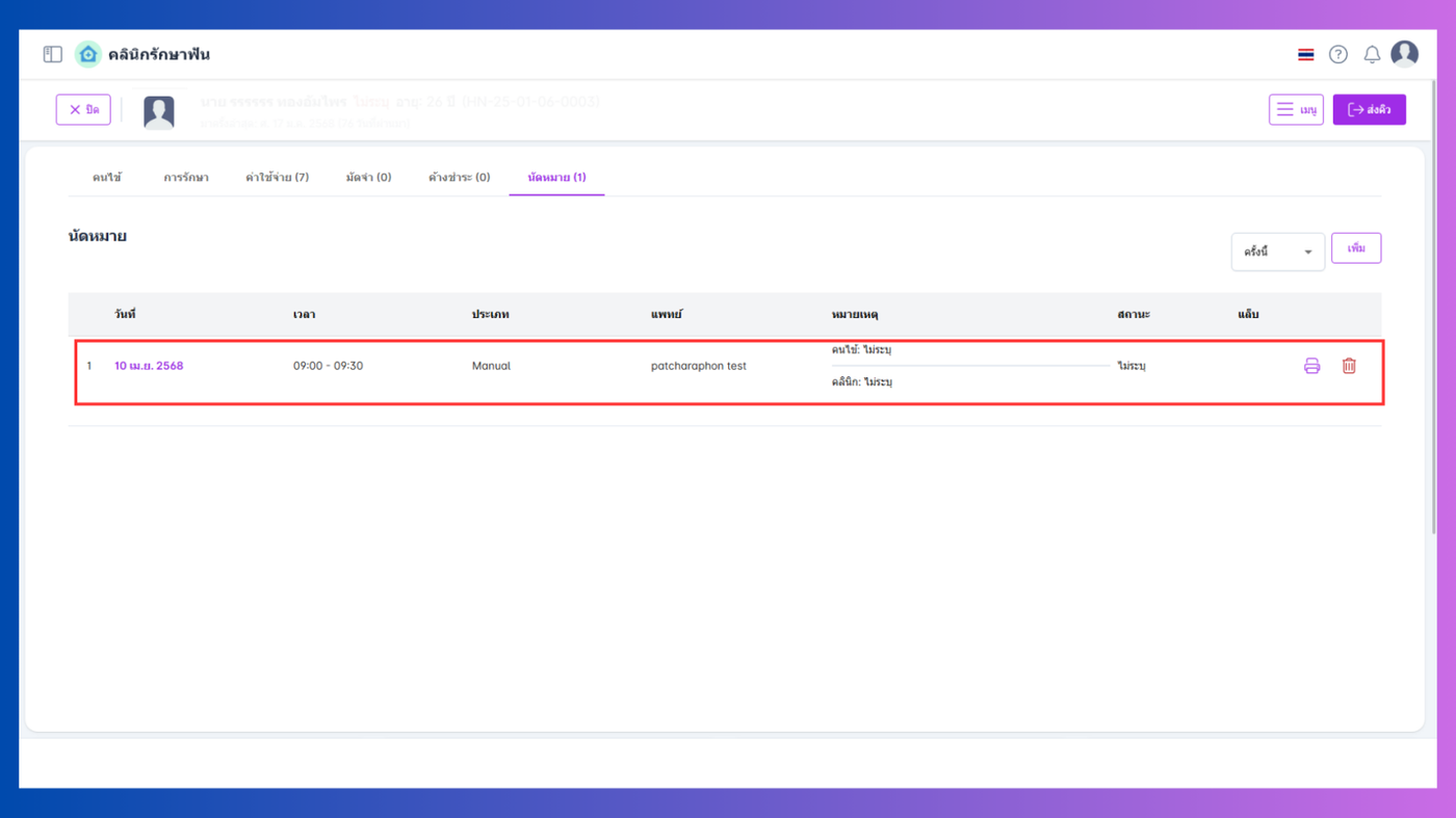 - ระบบจะแสดงการนัดหมายและสามารถพิมพ์ใบนัดหมายได้ และสามารถลบรายการนัดหมายได้ที่ไอคอนถังขยะ