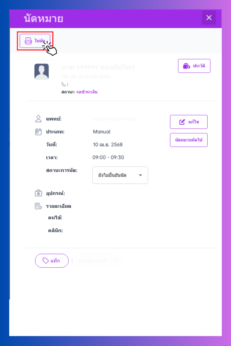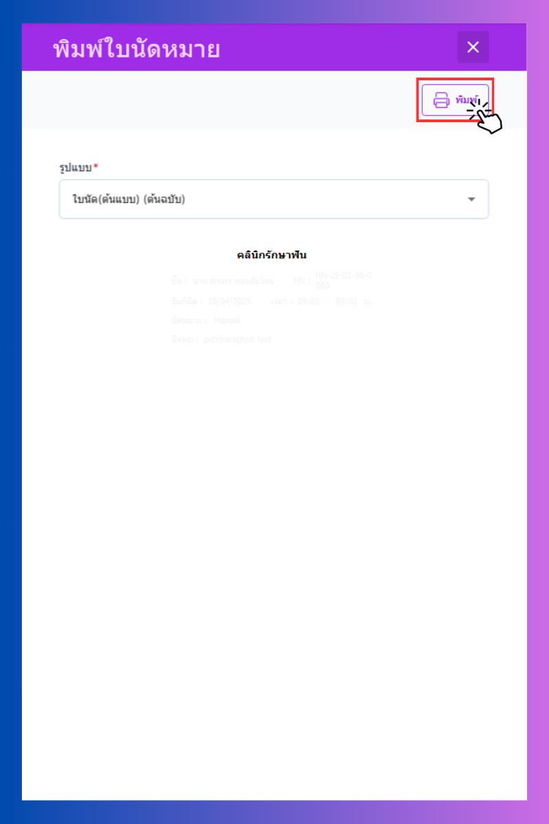 เข้าสู่หน้าพิมพ์ใบนัดหมาย คลิกที่พิมพ์