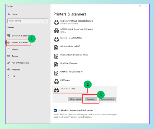 ขั้นตอนที่ 3 เข้าไปที่ Printers & scanners  หลังจากนั้นเลือกเครื่องปริ้นที่เราจะใช้งาน จากนั้นคลิกที่ Manage