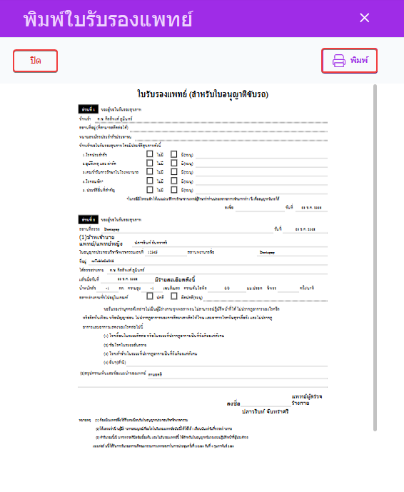 เมื่อผู้ใช้งานกดบันทึก ผู้ใช้งานจะสามารถสั่งพิมพ์ใบรับรองแพทย์ได้