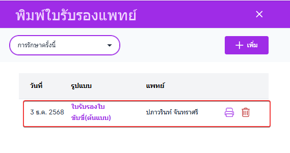 การรักษาครั้งนี้ : แสดงใบรับรองแพทย์ที่ถูกเพิ่มในวันที่เข้ารักษา