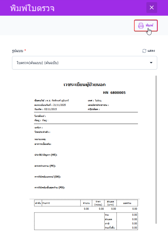 เมื่อผู้ใช้งานเลือกใบตรวจ ระบบจะเข้าสู่หน้าพิมพ์