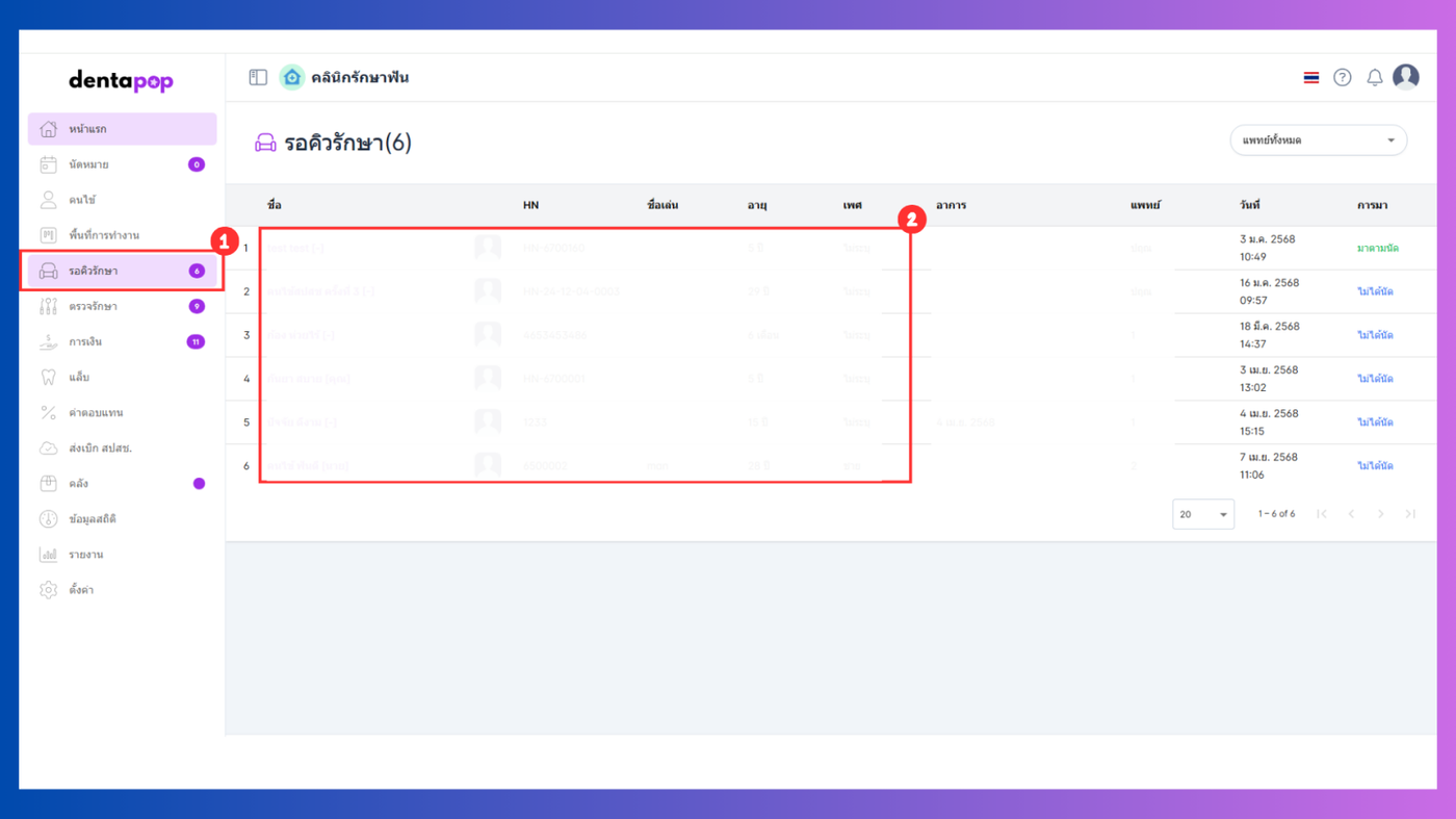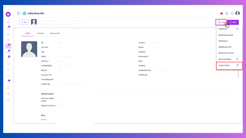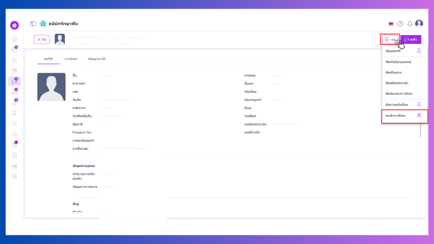 - เลือกคนไข้ที่ต้องการยกเลิกการรักษา คลิกที่ชื่อคนไข้