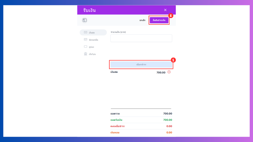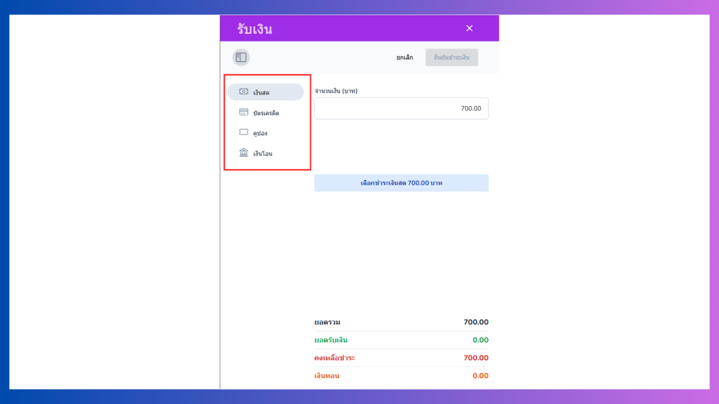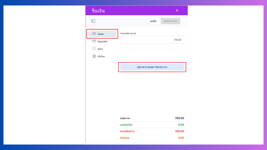 หากลูกค้าจ่ายเงินสดเกิน ระบบจะแสดงเงินทอนในช่องเงินทอน - เมื่อตรวจสอบเรียบแล้วและดำเนินการต่างๆเรียบร้อยแล้ว กดยืนยันชำระเงิน