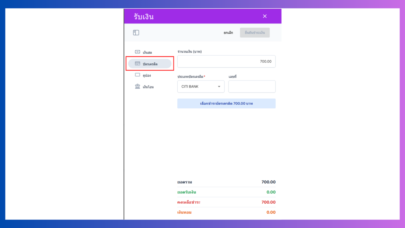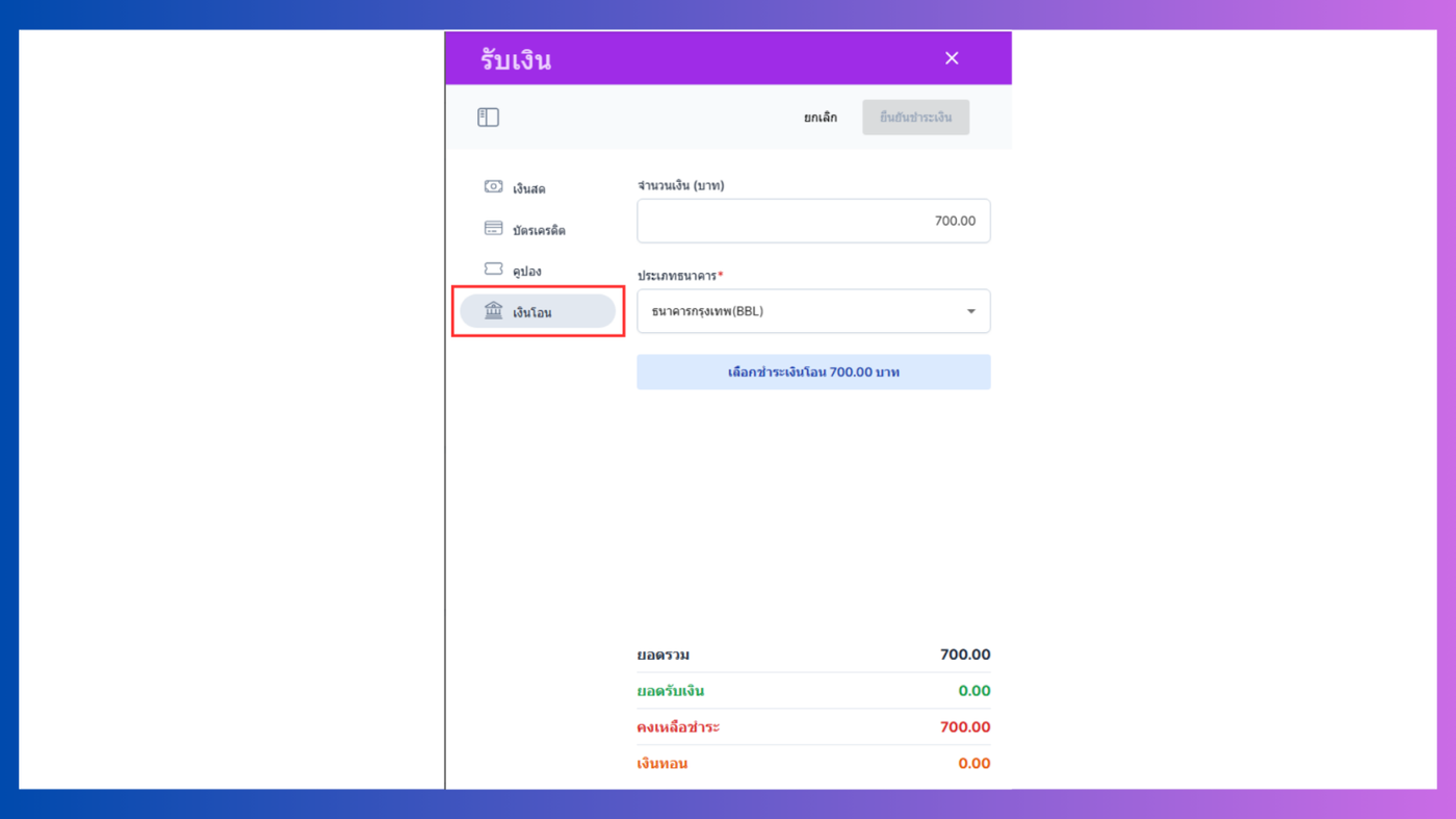 กรณีคูปองสมาชิก สามารถดูขั้นตอนการใช้งานได้ที่ -> การใช้งานคูปองและสมาชิก - เงินโอน ระบุยอดเงินที่ลูกค้าจ่าย และเลือกประเภทธนาคาร
