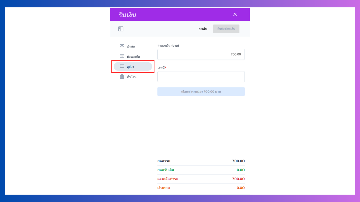 - คูปองและสมาชิก กรณีคูปองเงินสด ระบุยอดเงินที่ลูกค้าจ่าย เลือกคูปองเงินสด และ ระบุเลขที่