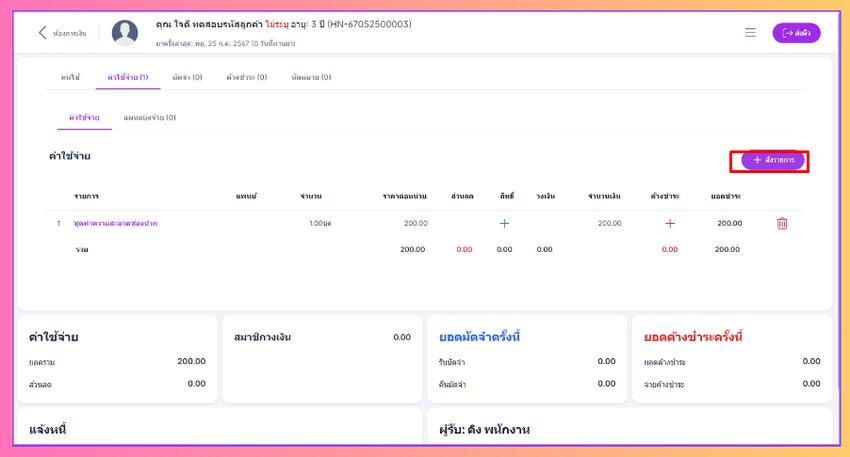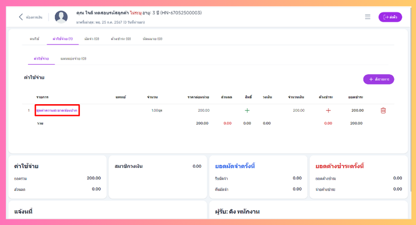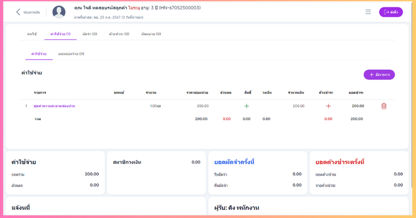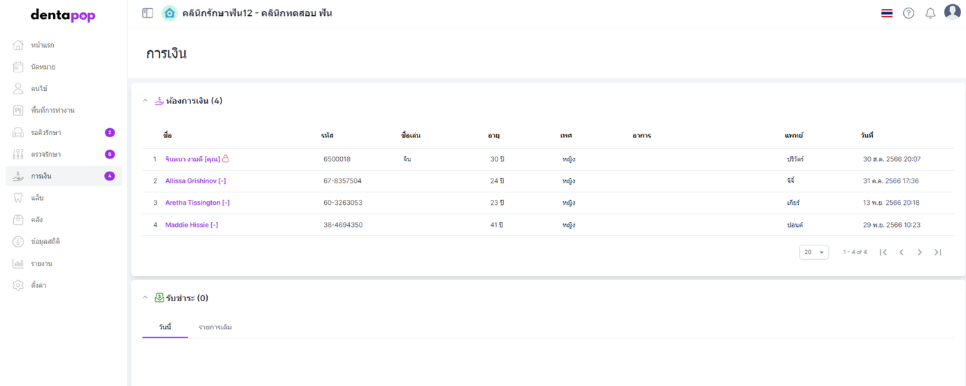 เมนูการเงินเป็นการทำงานเกี่ยวกับการเงิน เช่น การรับเงิน สิทธิการรักษา มัดจำ ค้างชำระ รวมไปถึงนัดหมาย โดยผู้ใช้งานต้องทำการส่งคิวคนไข้