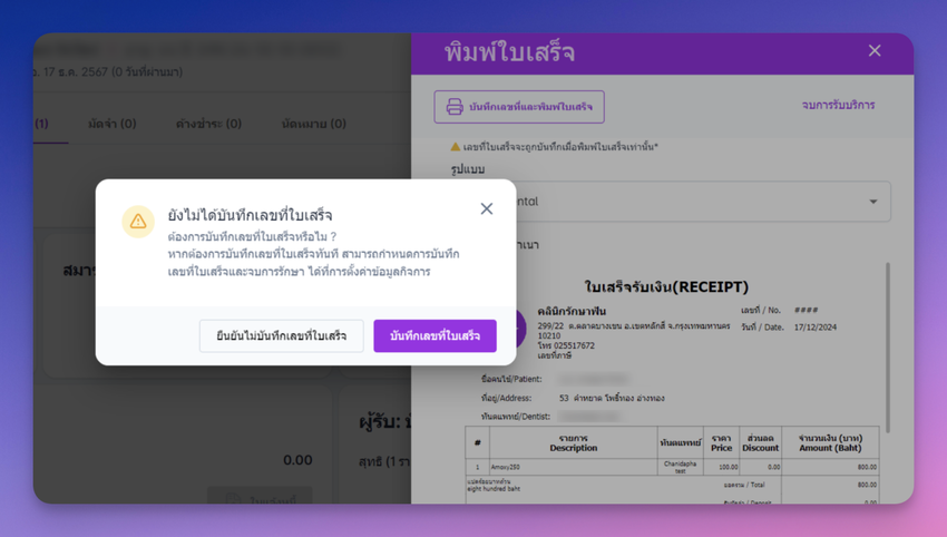 กรณีที่มีการจบการรักษา โดยไม่มีการพิมพ์ใบเสร็จ ระบบจะแจ้งเตือน เพื่อการยืนยันว่า ต้องการบันทึกเลขที่ใบเสร็จหรือไม่