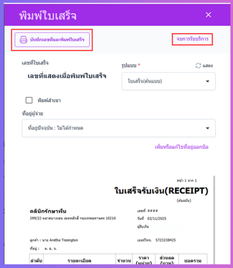เมื่อยืนยันชำระเงินแล้ว ระบบจะเข้าสู่หน้าพิมพ์ใบเสร็จ ซึ่งผู้ใช้งานจะสามารถสั่งพิมพ์ได้จากส่วนนี้ โดยการเลือกรูปแบบเอกสาร คลิกคัดลอก(หากต้องการทำสำเนาใบเสร็จ) หลังจากนั้นคลิกที่"พิมพ์" เพื่อสั่งพิมพ์ใบเสร็จ เมื่อดำเนินการตามขั้นตอนเสร็จเรียบร้อยแล้วหรือไม่ต้องการสั่งพิมพ์ใบเสร็จสามารถกดจบบริการด้านขวาบนได้เลย