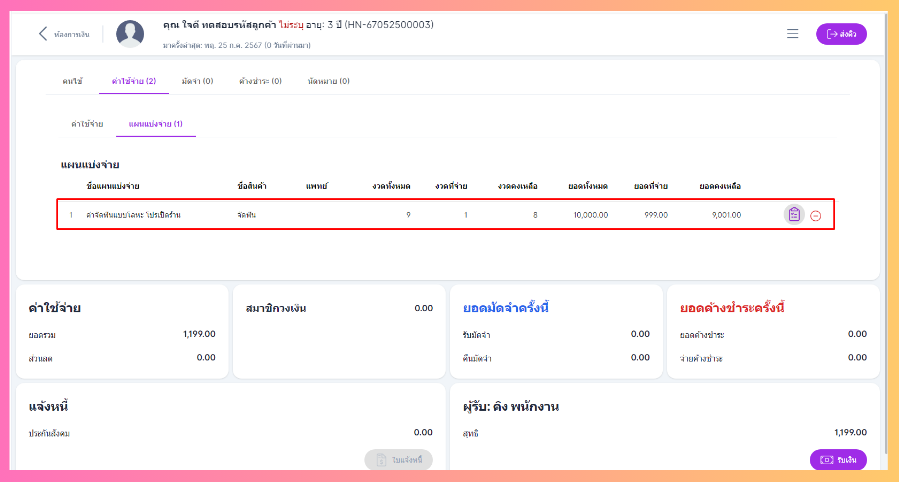 หัวข้อแผนแบ่งจ่ายจะแสดงรายการเมื่อ ผู้ใช้งานสั่งรายการและกำหนดแผนแบ่งจ่ายให้กับรายการนั้น
