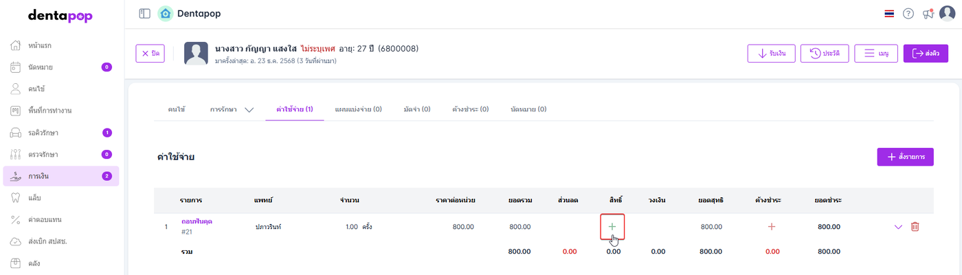 ผู้ใช้งานทำการสั่งรายการ เมื่อผู้ใช้งานทำการสั่งรายการเสร็จสิ้นจะแสดงสัญลักษณ์ +(บวก) ในหัวข้อสิทธิ์ให้ผู้ใช้งานคลิก +(บวก)