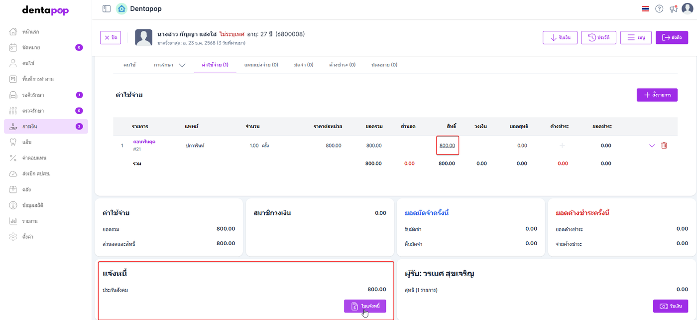 ระบบจะแสดงรายละเอียดแจ้งหนี้ โดยแสดงข้อมูล สิทธิ์ที่ผู้ใช้งานเลือกและจำนวนเงินที่ทำการเบิกสิทธิ์ ผู้ใช้งานสามารถพิมพ์เอกสารใบแจ้งหนี้โดยคลิก ใบแจ้งหนี้