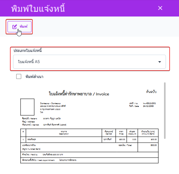 ผู้ใช้งานสามารถเลือกประเภทใบแจ้งหนี้ และคลิก พิมพ์ เพื่อทำการพิมพ์ใบแจ้งหนี้