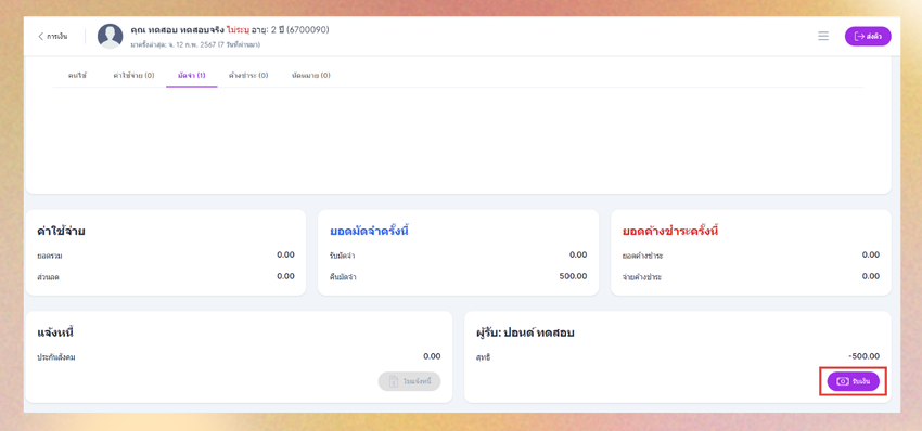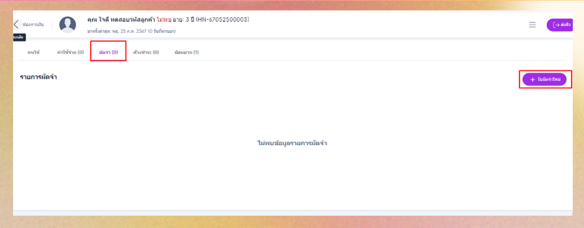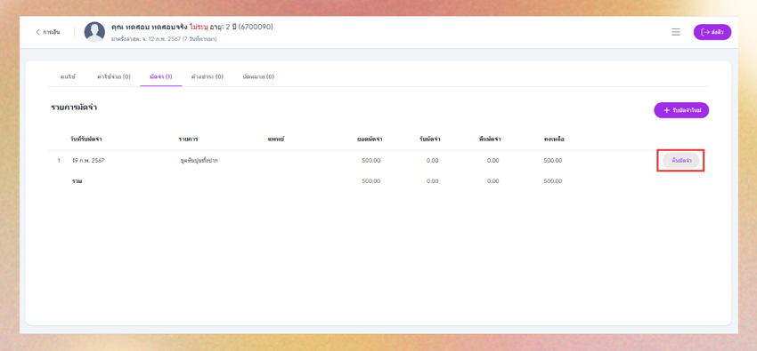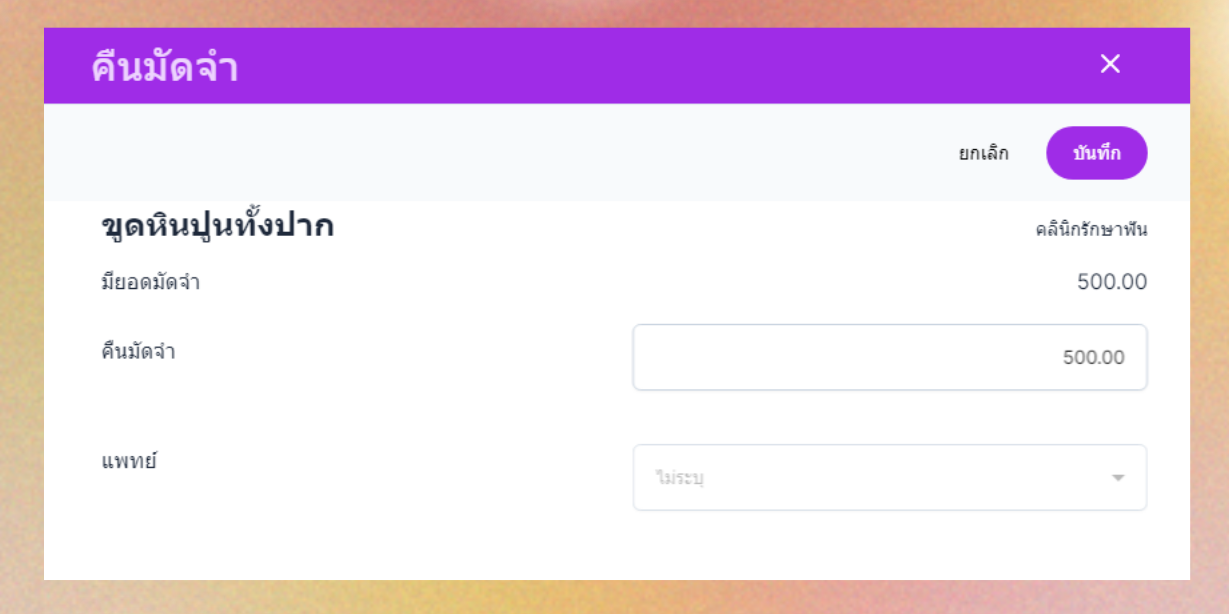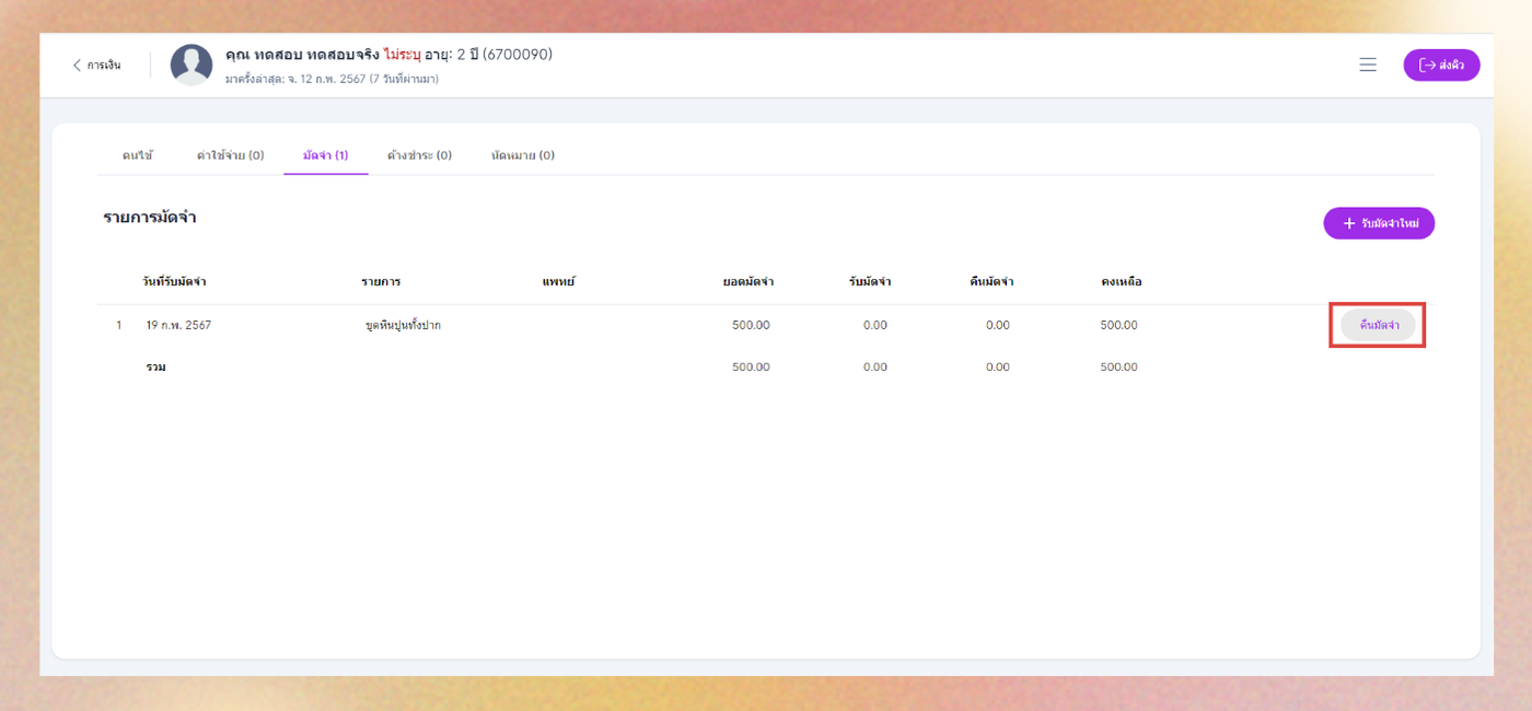 เมื่อคนไข้เข้ามาทำการอีกครั้ง ในเมนูการเงิน หัวข้อมัดจำ ระบบจะแสดงรายการมัดจำและปุ่มคืนมัดจำ