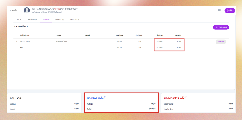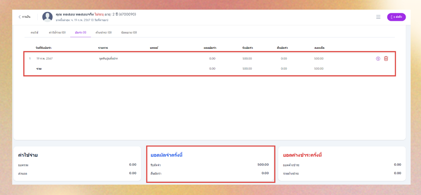 - ลบรายการมัดจำ : คลิกไอคอนถังขยะท้ายรายการ