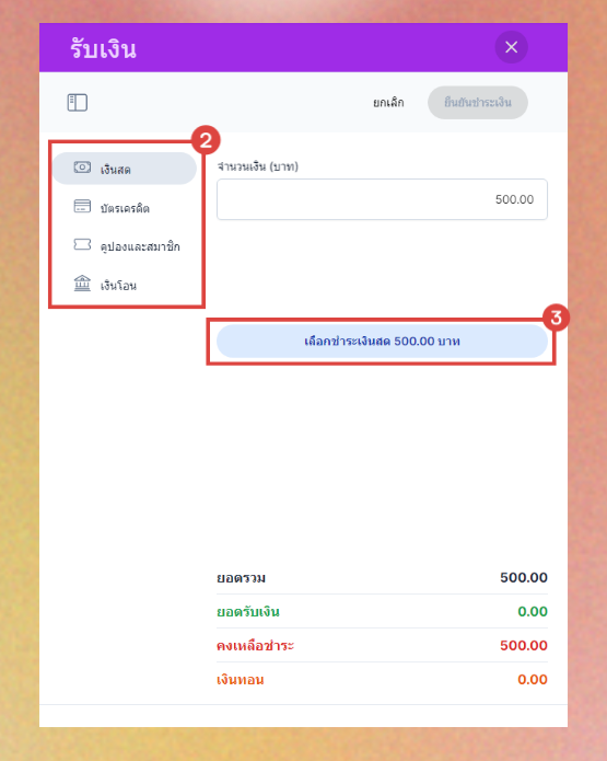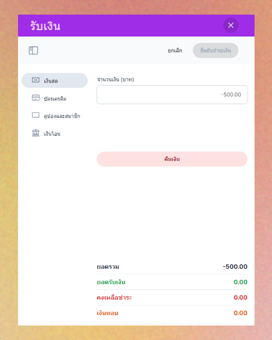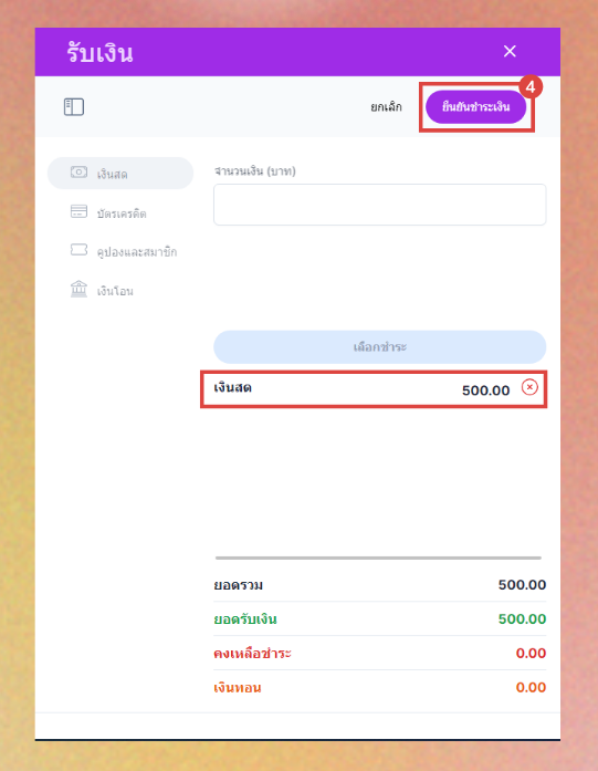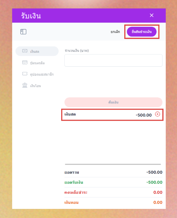หากลูกค้าจ่ายเงินสดเกิน ระบบจะแสดงเงินทอนในช่องเงินทอน - เมื่อตรวจสอบเรียบแล้วและดำเนินการต่างๆเรียบร้อยแล้ว กดยืนยันชำระเงิน