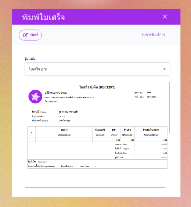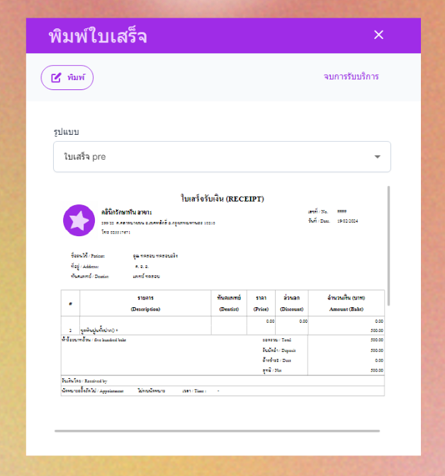 ระบบจะแสดงหน้าพิมพ์ใบเสร็จให้ผู้ใช้พิมพ์ใบเสร็จ และ กดจบการรับบริการได้