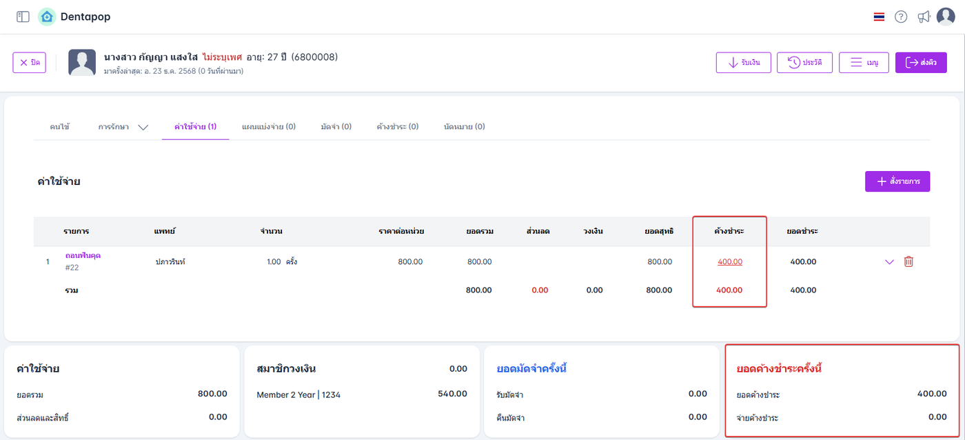 ยอดค้างชำระจะถูกแสดงในหัวข้อ ค้างชำระ และ ยอดค้างชำระครั้งนี้