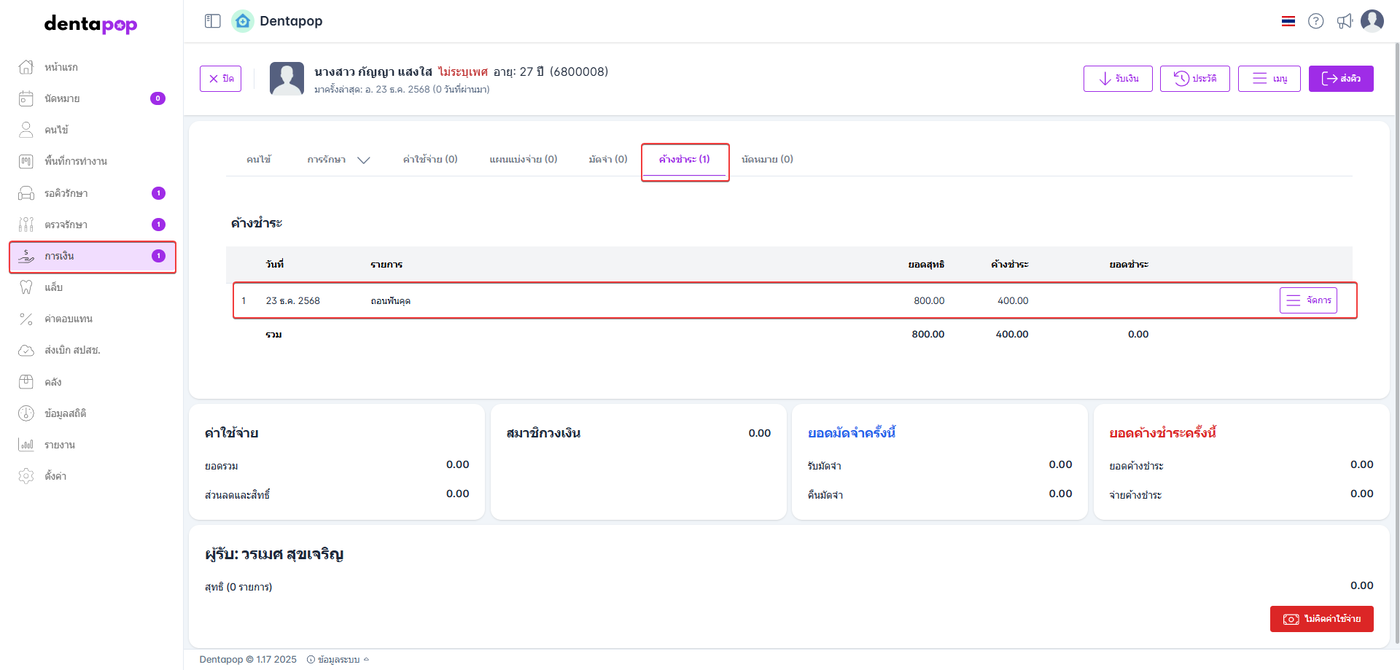 ผู้ใช้งานสามารถดูประวัติการชำระและยกเลิกยอดค้างได้ที่หน้าประวัติของคนไข้ โดยมีขั้นตอนดังนี้
