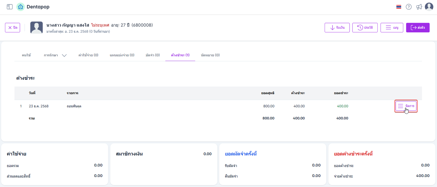ในแถบหัวข้อใบเสร็จจะแสดงรายการใบเสร็จต่างๆ โดยผู้ใช้งานสามารถคลิกที่ จัดการ เพื่อดูประวัติการชำระและยกเลิกยอดค้างชำระคนไข้