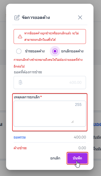 ผู้ใช้งานคลิก บันทึก เพื่อบันทึกการยกเลิกยอดค้าง