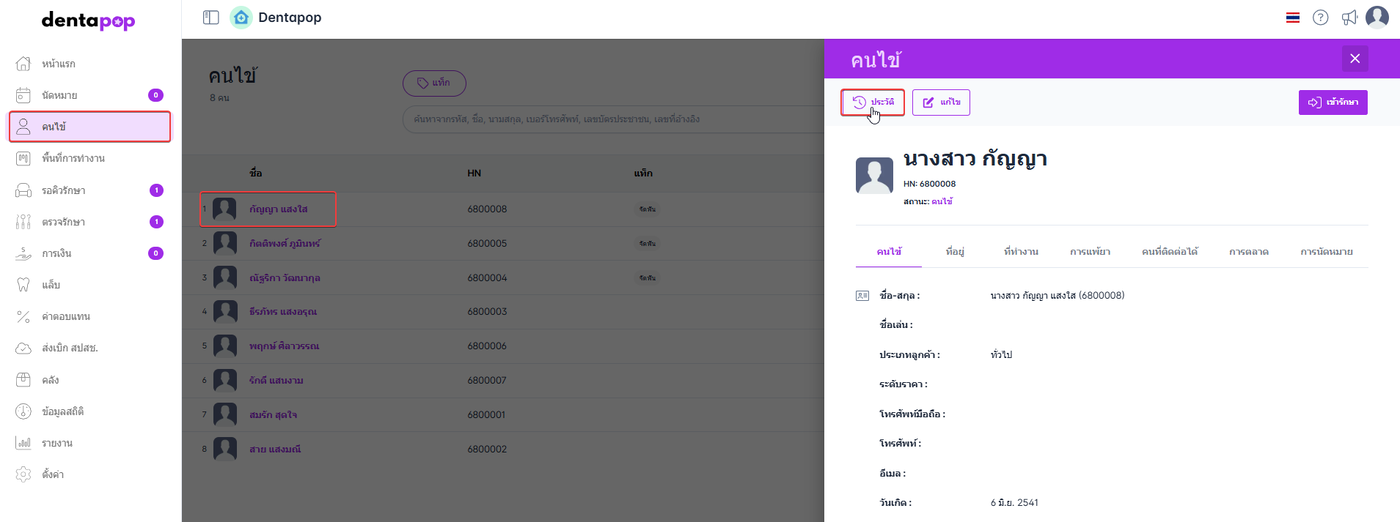 ผู้ใช้งานคลิก ประวัติ ของคนไข้
