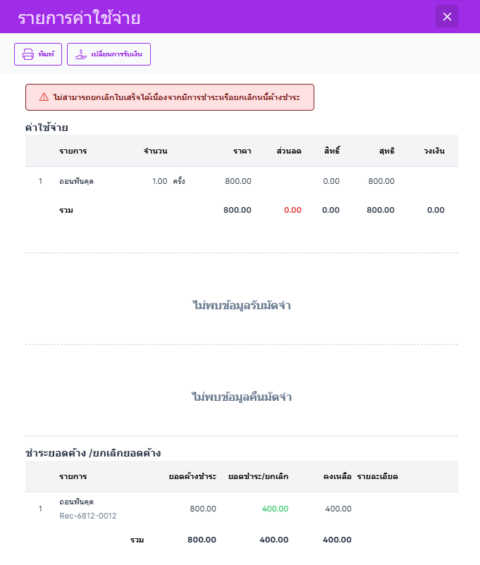 ใบเสร็จที่มีการ จ่ายค้างชำระ หรือ ยกเลิกยอดค้างชำระ จะไม่สามารถ ยกเลิกใบเสร็จได้
