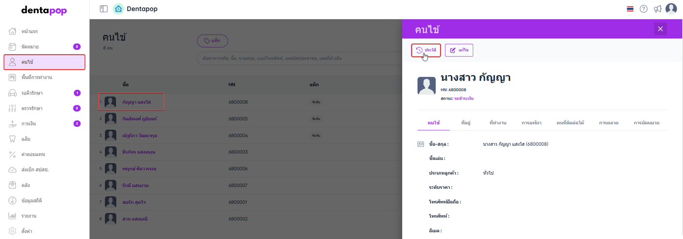 ผู้ใช้งานสามารถดูบัตรสมาชิกของคนไข้ได้ในประวัติของคนไข้ ในแถบหัวข้อ สมาชิก หากคนไข้ไม่มีบัตรสมาชิกสามารถซื้อบัตรสมาชิกได้โดยดูขั้นตอนใน วงเงินและบัตรสมาชิก