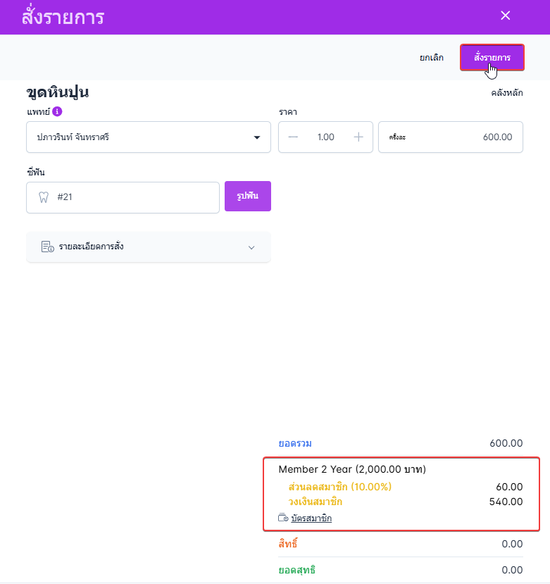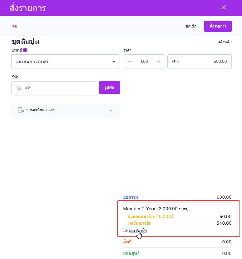 ผู้ใช้งานกรอกข้อมูลรายละเอียด หากบัตรสมาชิกสามารถใช้กับรายการนั้นได้จะแสดงข้อมูลชื่อบัตรสมาชิก ส่วนลดสมาชิก วงเงินสมาชิก