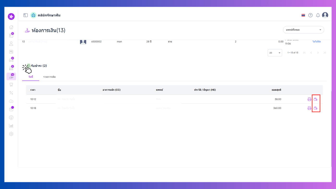 - ผู้ใช้งานสามารถเข้าสู่หน้าประวัติคนไข้ที่ต้องการยกเลิกได้โดยเมนูรับเงิน