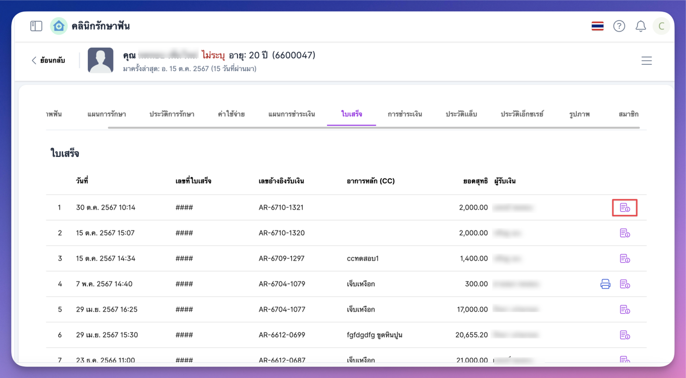 - ให้ผู้ใช้งานเข้าสู่หน้าประวัติคนไข้ที่ต้องการยกเลิกใบเสร็จ จากนั้นไปที่หัวข้อใบเสร็จ