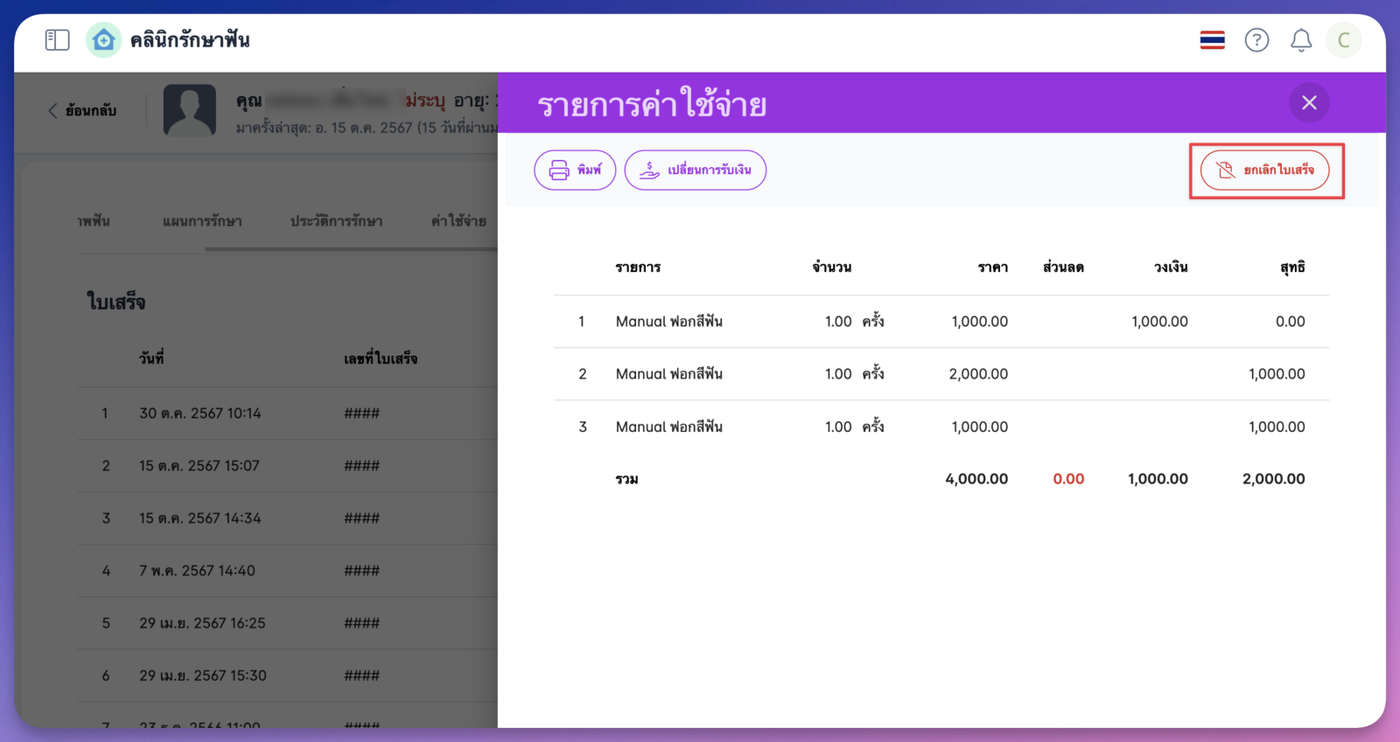 ทำการยกเลิกใบเสร็จ ได้ที่ปุ่มยกเลิกใบเสร็จ